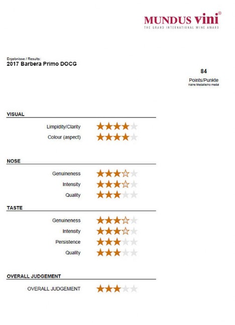 Our wines are participating in various Italian and international competitions, where collect considerable awards. In particular, our Barbera d'Asti Capri was assessed by the international competition "Mundus vini" (the grand international wine award) with a more than excellent score 84/100.